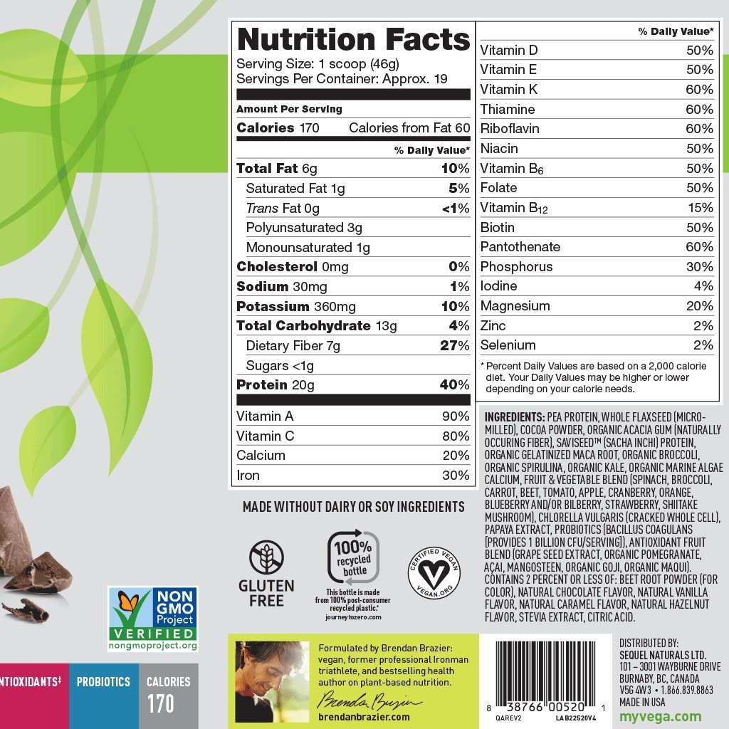 We put the best in so you get the best out. Made from whole food, non-gmo ingredients, vega one all-in-one nutritional shake gives you everything you need-all in one delicious scoop. 20 grams of premium plant-based protein, 6 servings of greens, and 50% daily value of food-based vitamins and minerals made from fruits and vegetables, plus fiber, omega-3s, antioxidants and probiotics in each serving of vega one gives you the nutritional confidence to enjoy your full life-no matter how much you pack in. Vega one is non-gmo project verified, vegan certified, low-glycemic, gluten-free and made without dairy or soy ingredients. Enjoy vega one in French vanilla, chocolate, berry, vanilla chai or natural flavors.